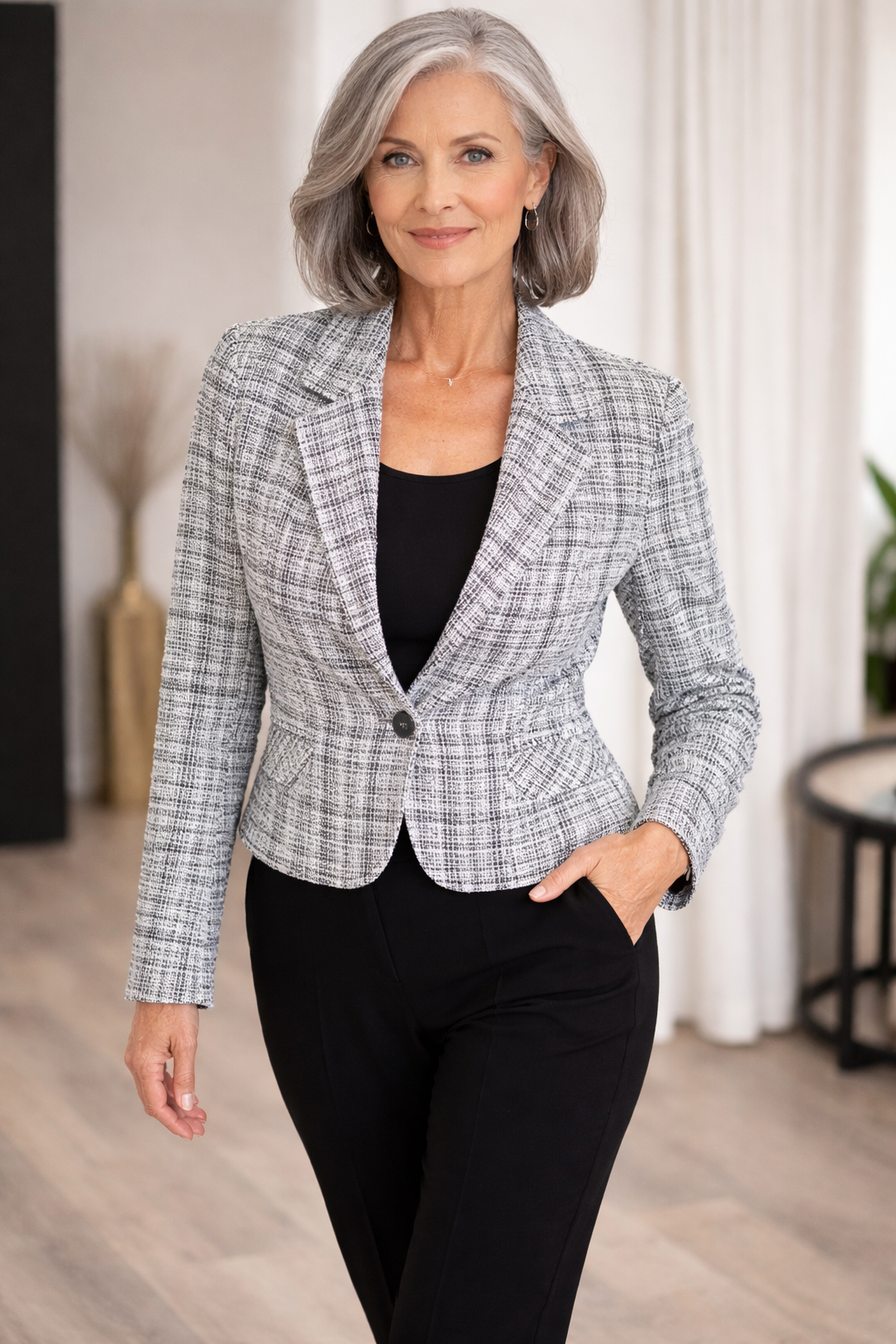 This sophisticated black and white textured tweed blazer is the definition of timeless elegance. Designed with a flattering tailored silhouette, structured lapel, and waist-defining shape, this jacket instantly creates a polished, confident look.
