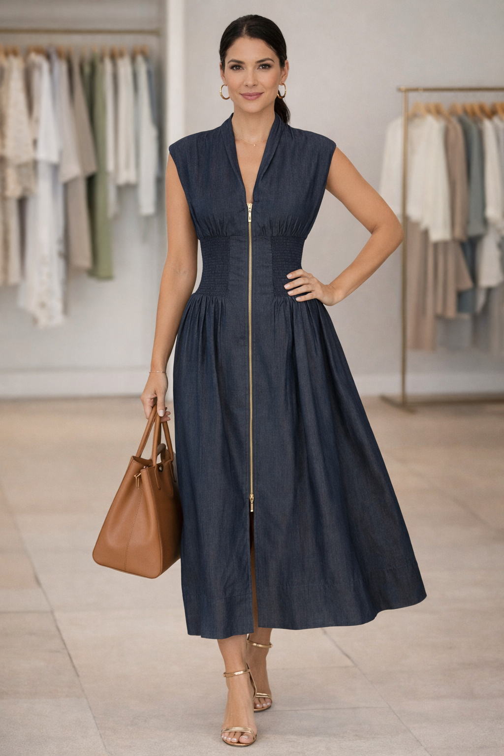 Elevate your wardrobe with effortless sophistication in our Modern Muse Zip-Front Denim Midi Dress. Designed to flatter, this sleeveless midi features a sculpting smocked waist that defines your shape and a bold gold front zipper that adds a touch of modern edge.